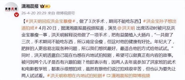 4 月 20 日,洪金宝儿子洪天明面对媒体追问,没有回避、没有煽情,直白道出父亲暴瘦的核心原因:洪金宝先后完成三次有益菌植入大肠手术,为保证手术效果与恢复质量,全程严格禁食,体重下降是医疗过程中的正常结果。